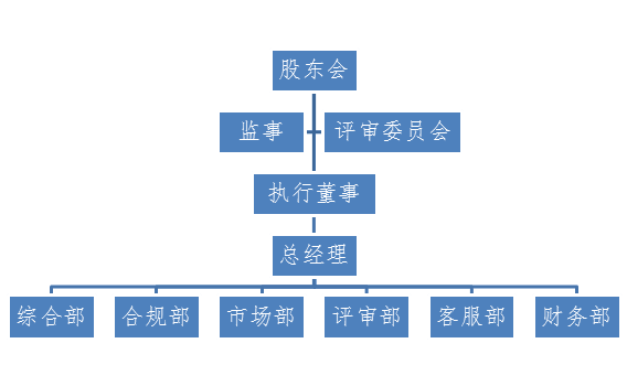 为了建立现代企业制度的企业法人治理结构,公司实行执行董事领导下的总经理负责制,并分别设立综合部、合规部、评审部、市场部、财务部和客服部等部门,以确保公司的高效、规范和科学运营。
